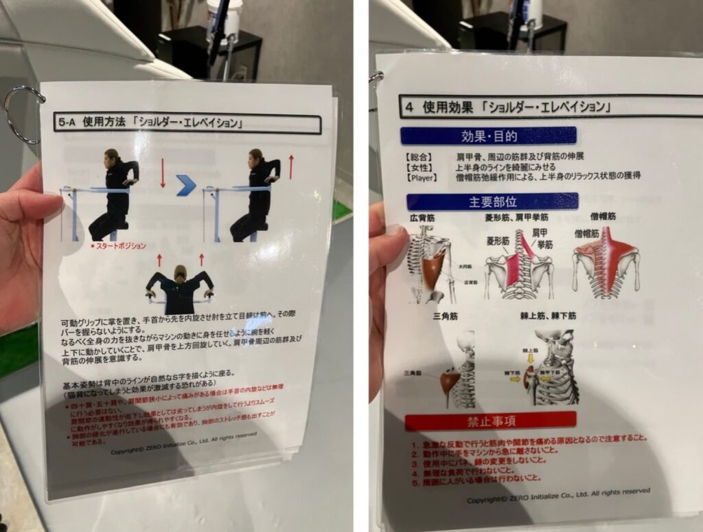 また、あまり見たことのないマシンには、使用方法や使用効果が具体的に書いてあるマニュアルもあるので、非常にわかりやすいです。